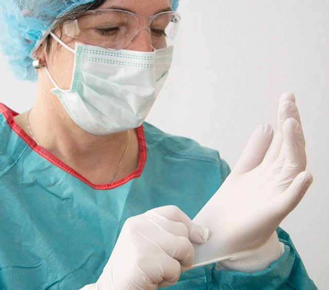 [Image : Dentiste en lunettes, masque, blouse et gants.]