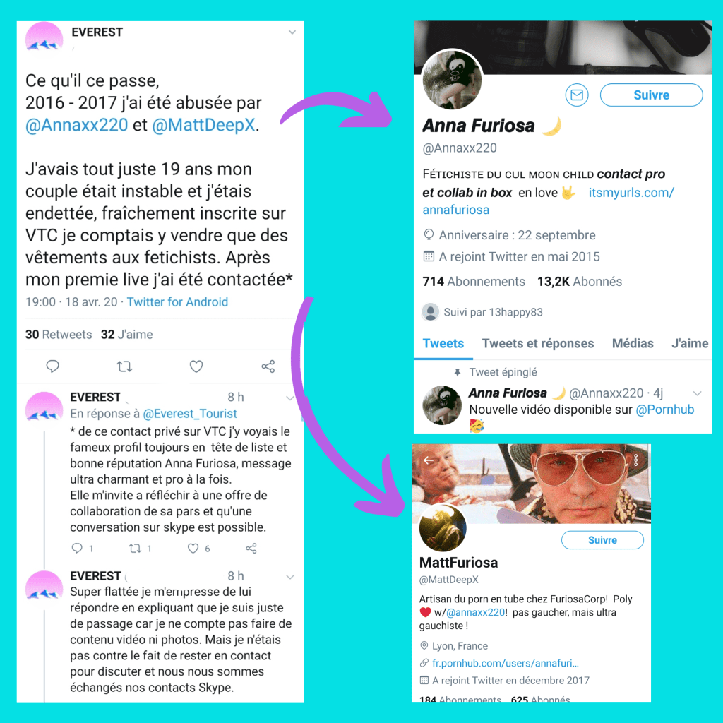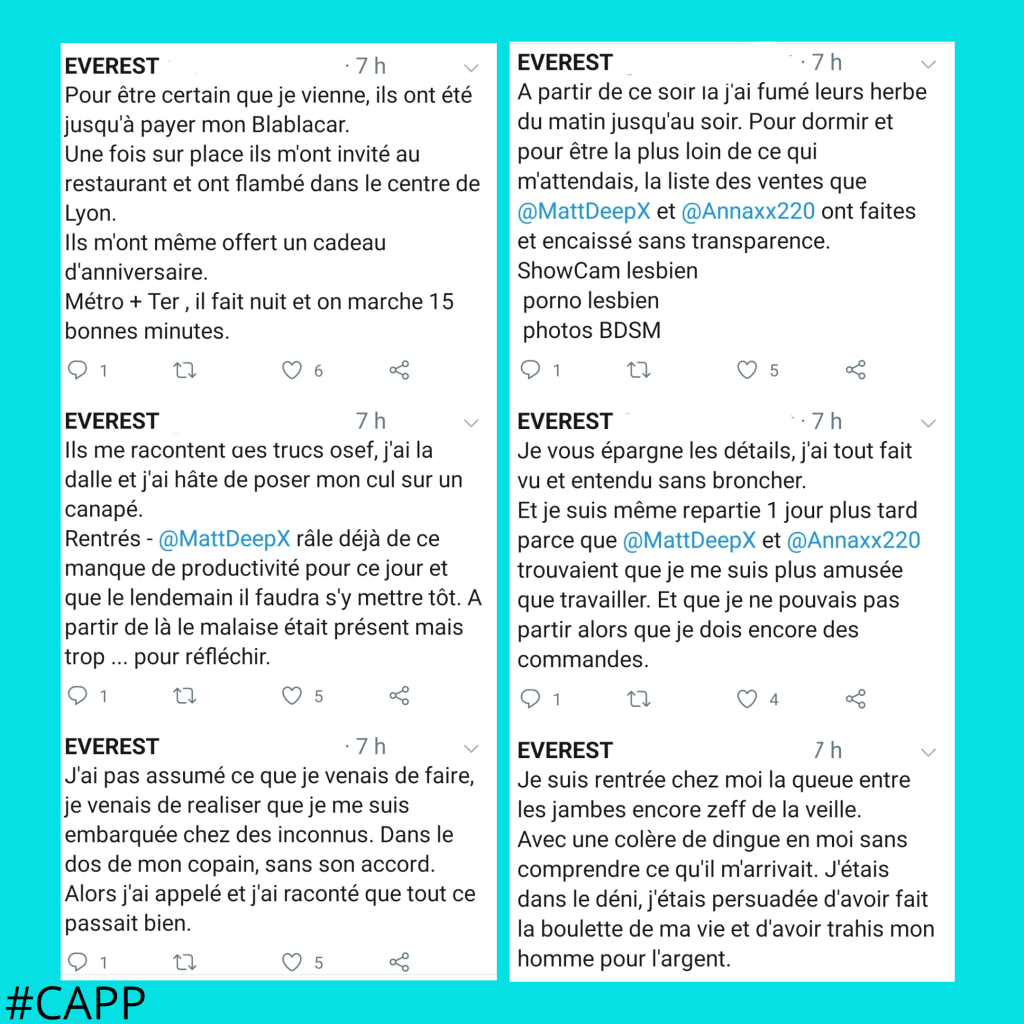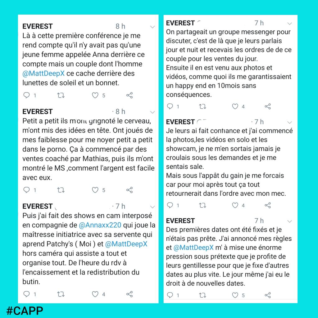 Everest est le pseudo d’une jeune femme dont nous avons trouvé le témoignage sur twitter. Le but dans la publication de son histoire et de prévenir les femmes des techniques de manipulation et de la violence dont on fait preuve ses bourreaux, deux personnes reconnues dans le monde du Porno. Everest sait ne pas être la première et sait qu’elle ne sera pas la dernière victime, mais se bat actuellement pour que ses agresseurs ne restent pas impunis.