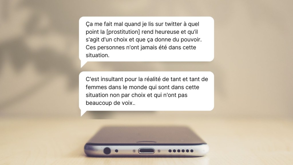 Alors je l’ai fait (« le travail du sexe ») pour éviter de me retrouver à la rue, où je pensais que je serais blessée de toute façon. C’est pourquoi je suis blessée lorsque je lis sur Twitter que les gens sont heureux, qu’ils ont le choix et qu’ils se sentent plus forts. Ces personnes n’ont jamais été dans cette situation. C’est une insulte à la réalité de tant de femmes dans le monde qui ne sont pas dans cette situation par choix et qui n’ont pas beaucoup de voix.