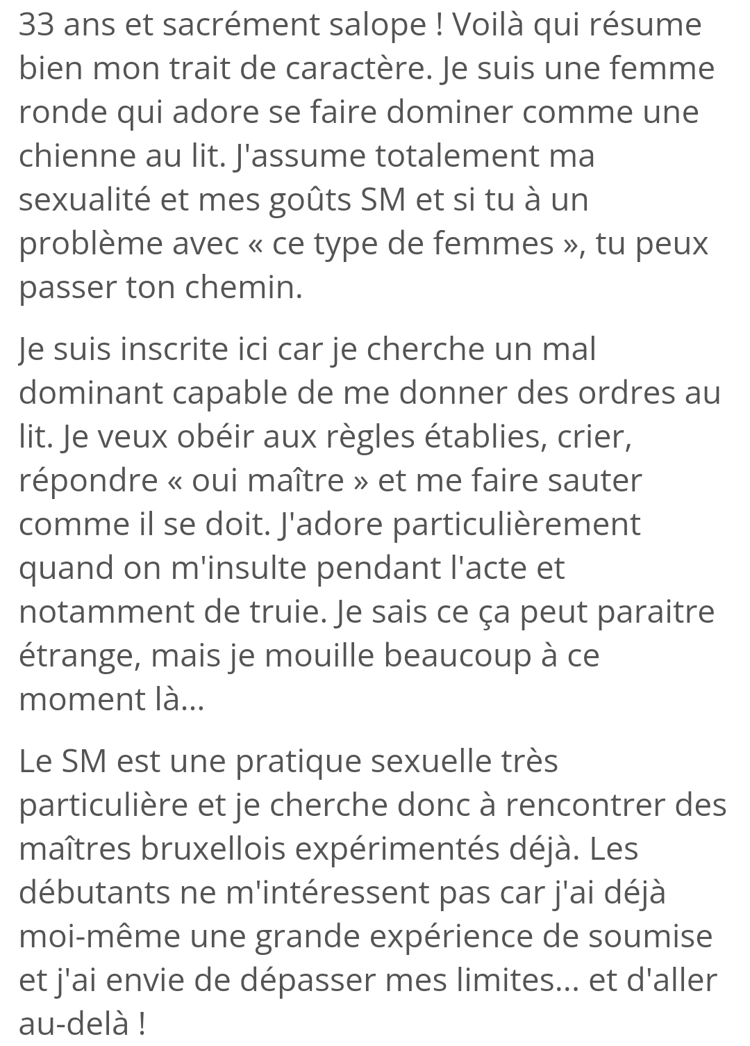 Ce mensonge me dérange vraiment. Un pourcentage très élevé de femmes « adeptes du sadomasochisme » ont subi des agressions sexuelles pendant leur enfance comparé aux femmes qui ne pratiquent pas le sadomasochisme.