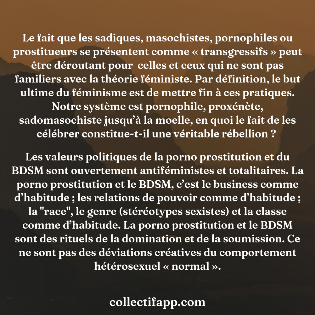 Choisir le sadomasochisme, compte tenu de notre oppression, est un acte de profonde trahison. Les idées dont je parle ne sont pas nouvelles (voir les références à la fin de cet article), mais j’espère qu’elles constitueront un résumé utile qui pourra être utilisé par les féministes pour constater que la plupart des affirmations des sadomasochistes sont tout simplement fausses. - Lettre ouverte à tous les « clients » de prostitution du monde entier