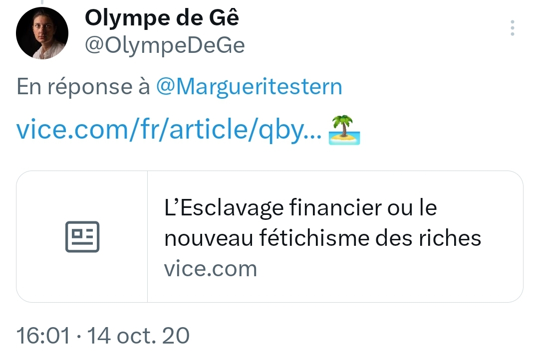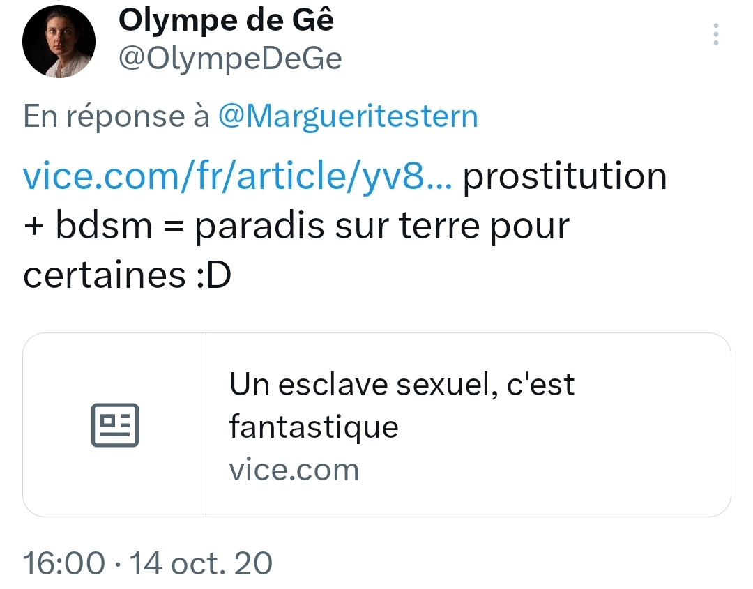 En France, l’autoproclamée « réalisatrice de porno féministe » Olympe de G (créatrice des contenus audio Voxxx), qui n’est autre que l’une des élèves de la proxénète Erika Lust, fait elle aussi l’apologie de l’esclavage et de la torture sexuelle.