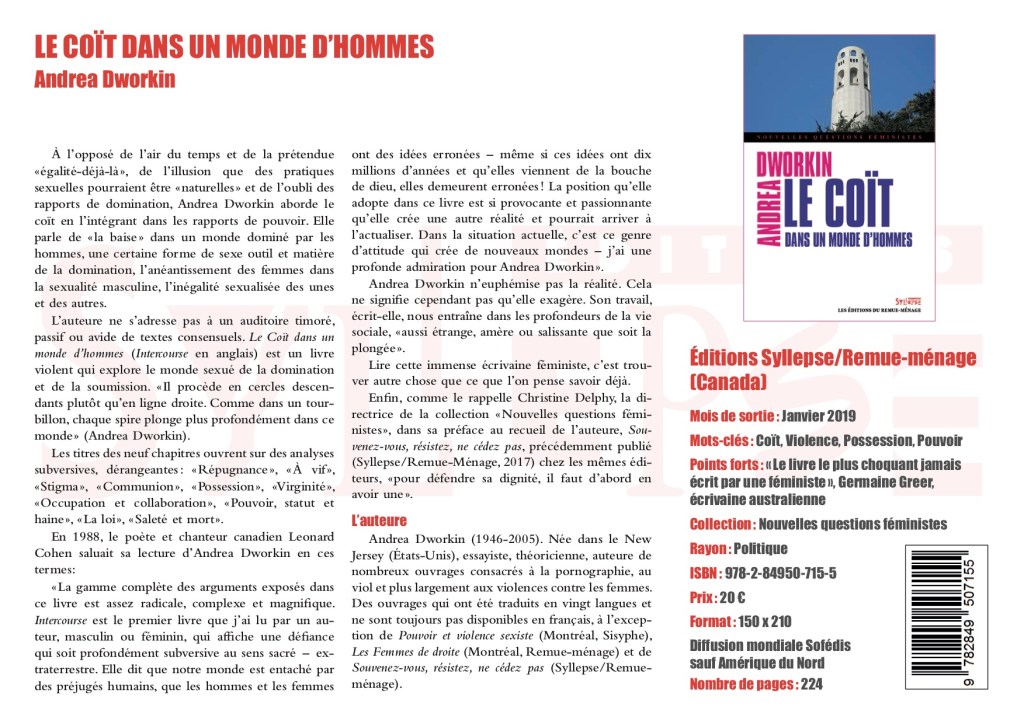 Certaines femmes rejettent le féminisme et n’hésitent pas à se montrer racistes et homophobes. Comment expliquer cet apparent paradoxe ? Andrea Dworkin pense que les femmes de droite concluent ce qui leur paraît le marché le plus avantageux : en échange de leur conformité aux rôles traditionnels, la droite leur promet la sécurité, le respect, l’amour. Elles font le pari qu’il est préférable de prendre le parti du patriarcat plutôt que de combattre ce système dont la violence est trop souvent meurtrière. Mais la droite et l’antiféminisme se fondent sur le mépris des femmes et encouragent l’exploitation de leur sexualité. Une réflexion brutale et sans concession, qui appelle à la révolte féministe. Préface de Christine Delphy.